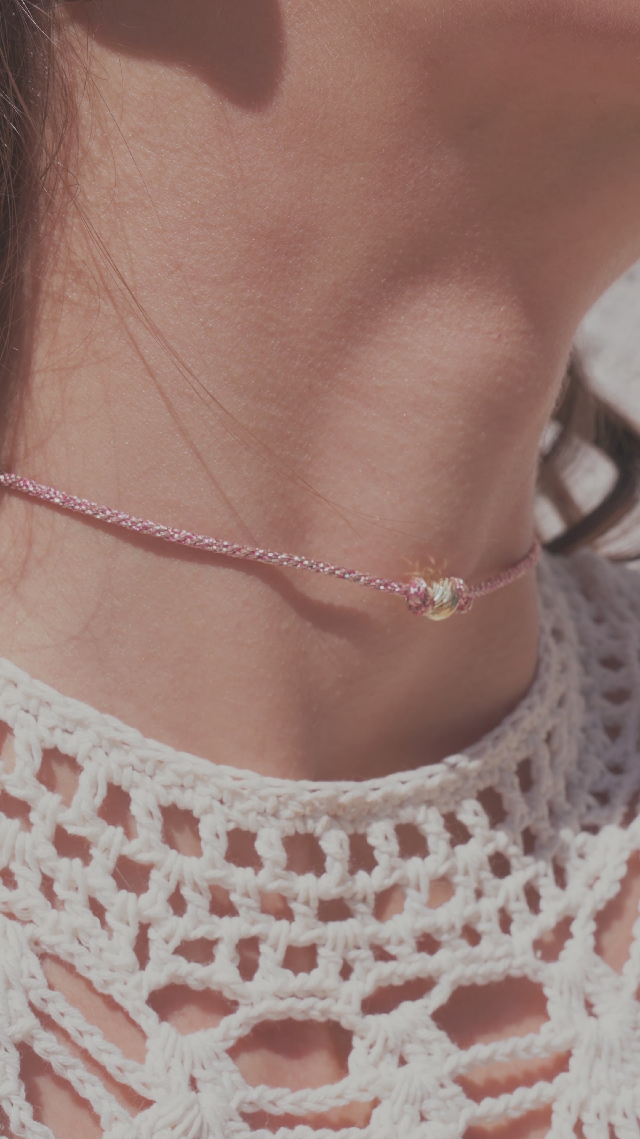 Its soft golden threads, rich in deep burgundy with a subtle sheen, gently hold an 18k rose gold bead, a luminous accent that recalls sun-drenched stones and the rosy glow of twilight skies.